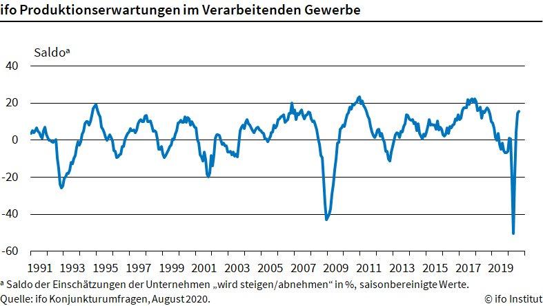 Automobil-Unternehmen erwarten weiterhin eine Zunahme ihrer Produktion, sind nicht mehr ganz so optimistisch wie im Monat zuvor: Der Indikator fiel leicht auf plus 48 Punkte, nach plus 49 im Juli. Von verbesserten Aussichten berichteten die Möbelhersteller mit 19 Punkten, nach 7 im Juli, und die Hersteller von Datenverarbeitungsgeräten mit 12 Punkten, nach plus 1 Punkt im Juli.