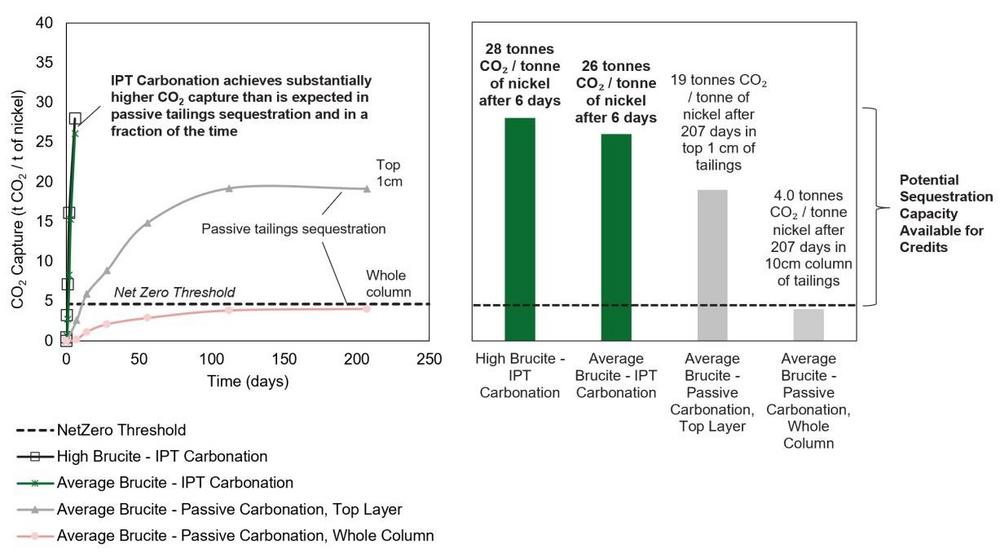 Die IPT-Karbonisierung, bei der es sich um ein aktives Verfahren handelt, hat Vorteile gegenüber der passiven mineralischen Kohlenstoffabscheidung, da die Methode zur Quantifizierung und Überprüfung der CO2 -Abscheidung wesentlich einfacher sein dürfte. Unter Verwendung einer Standard-Kohlenstoffbilanz in der Mineralverarbeitungsanlage kann das bei der IPT-Karbonisierung abgeschiedene CO2 quantifiziert werden, bevor die Tailings in das permanente Tailings-Lager entladen werden, so dass die Kohlenstoffkompensationen in Echtzeit als Teil eines standardmäßigen metallurgischen Buchhaltungssystems quantifiziert werden können. Canada Nickel geht davon aus, dass auch für die Quantifizierung der CO2 -Abscheidung durch passive Methoden Industriestandards entwickelt werden.