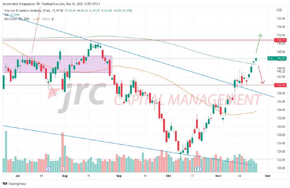 Vor dem gestrigen Börsenschluss ist die Aktie des amerikanischen Konzerns Procter & Gamble Company um 0,57% gestiegen. Vor dem anhaltenden Aufwärtstrend hatte der Kurs zuletzt am 10.10. ein Tief bei $122,18 markiert und ist seitdem zwischenzeitlich um zeitweise über 20% gestiegen. Grund für den Anstieg waren unter anderem die leicht über den Erwartungen der Analysten liegenden Gewinn- und Umsatzergebnisse des abgelaufenen Quartals. Aber auch die starke Position als zuverlässiger Dividendenzahler und Innovationen beispielsweise im Bereich nachhaltiger Verpackungen wie neuartiger Papierflaschen könnten gute Kaufargumente darstellen.