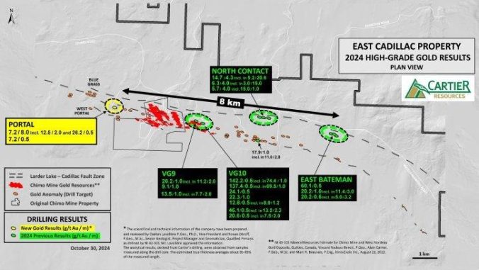 „Die Ergebnisse aus der Goldzone Portal bestätigen die historischen hochgradigen Goldgehalte“, erklärt President und CEO Philippe Cloutier, der hinzufügt: „Im Jahr 2024 wurden im Konzessionsgebiet East Cadillac insgesamt 5 hochgradige Goldzonen auf einer 8 km langen Teilstrecke der Larder Lake-Cadillac-Verwerfungszone entdeckt.“