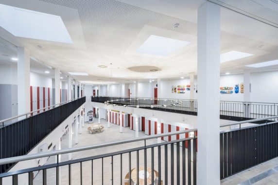 Das Gebäude ist von hellen Farbtönen geprägt. Insgesamt 10 Glaskuppeln und die Pfostenriegelfassade dienen im Atrium als natürliche Lichtquellen. Des Weiteren wurden umlaufend LED-Deckenleuchten im Erd- und Obergeschoss installiert, welche auch im entlegensten Winkel eine angenehme Helligkeit versprechen.