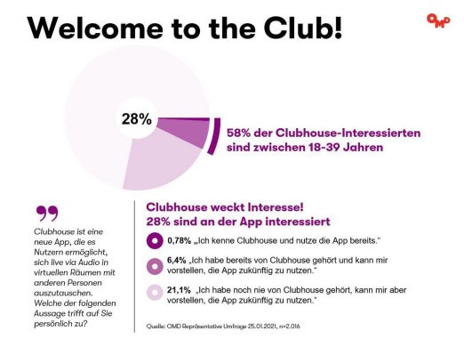 „Audio liegt im Trend und erkämpft sich seine Nische in der sonst sehr bild- und textlastigen Social Media-Welt“, erklärt Stephan Naumann, Director Insight Planning OMD. „Die nächsten Monate werden zeigen, wie nachhaltig der Clubhouse-Hype ist und ob die datenschutzrechtlichen Bedenken überwunden werden können. Schon jetzt steht bei audiofähigen Chaträumen auch Twitter Spaces als Konkurrent bereit.“