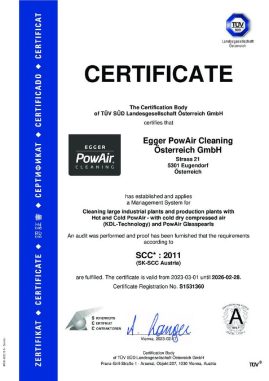 Industrycleaner Egger PowAir Cleaning GmbH certified by TÜV – SÜD until 2026 SCC* : 2011.