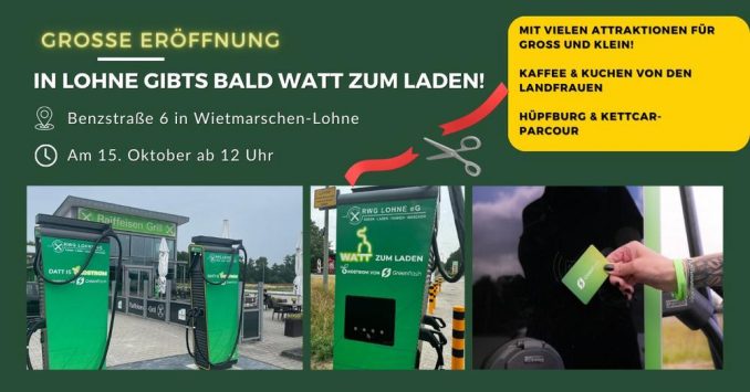 Die Eröffnung des Ladeparks beim Raiffeisen Grill und der Raiffeisen Tankstelle Lohne ist für den 15. Oktober geplant. Greenflash und die RWG Lohne lädt alle Interessierten ein, an diesem wichtigen Ereignis teilzunehmen und sich ein Bild von dem außergewöhnlichen Standort mit Tankstelle, Grill, Indoor Waschpark und Ladepark zu machen.