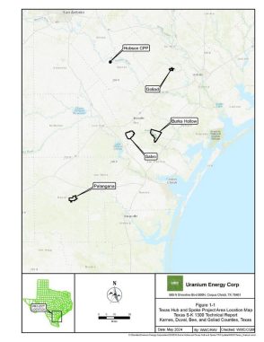 Die Plattform besteht aus fünf Projektgebieten ("Abbildung 1-1"): der Hobson Central Processing Plant ("CPP") und den Projekten Burke Hollow, Goliad, Palangana und Salvo, die sich in den Countys Karnes, Bee, Goliad und Duval in Texas befinden.  Die Hobson CPP wird als "Knotenpunkt" der Plattform dienen, während die anderen Projektgebiete als Satellitenanlagen oder "Speichen" fungieren.  Die Hobson CPP wird das gesamte in den anderen Projektgebieten gewonnene Uran verarbeiten.  Die Texas-Plattform liegt in der South Texas Uranium Province ("STUP"), die Teil der Küstenebene des Golf von Mexiko Beckens ("GMB") ist.