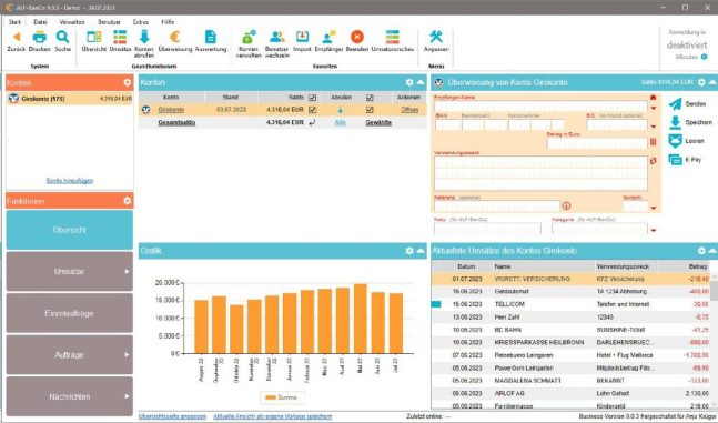 Diese Software ist von Anfang an sehr leicht und intuitiv bedienbar. Mit allen ALF-BanCo Versionen haben Sie stets den perfekten Überblick über Ihre Finanzen: Einnahmen und Ausgaben auf einen Blick, Überweisungen per Mausklick und über die Auswertungen entdecken Sie vielleicht noch Einsparpotential?