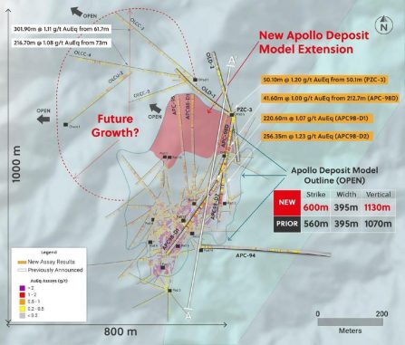 - Das überarbeitete Modell von Apollo, das den Teil der Mineralisierung abdeckt, der mit einem Drahtgitter versehen wurde, deckt nun ein erheblich erweitertes Volumen ab, das bis zu 600 Meter Streichen, 395 Meter Breite und 1.130 Meter in der Vertikalen misst und in den meisten Richtungen noch erweiterungsfähig ist. Die Mineralisierung bei Apollo beginnt an der Oberfläche (d.h. 271 Meter @ 3,43 g/t AuEq aus 0 Metern Tiefe in APC-43; siehe Pressemitteilung vom 11. April 2023) und wurde bis zu 1.130 Meter unterhalb der Oberfläche gebohrt (d.h. 202 Meter @ 2,16 g/t AuEq in 1.130 Metern Tiefe in APC88-D1; siehe Pressemitteilung vom 30. Januar 2024). Das interne Modell umfasst nur den südlichen Teil des neu entdeckten und integrierten Systems. Es ist nun geplant, Apollo aggressiv in nördlicher Richtung zu erweitern und gleichzeitig weiterhin hochgradige Unterzonen innerhalb des mit einem Drahtgitter versehenen Teils des Systems anzupeilen.