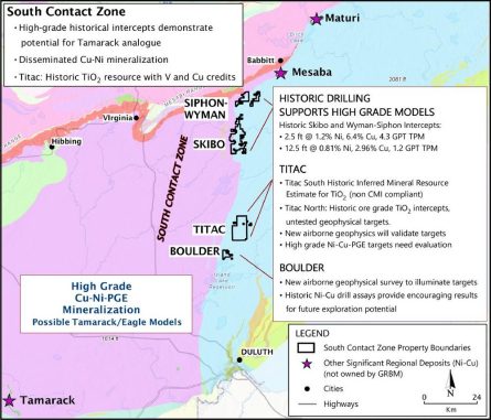 Green Bridge Metals Corporation (ehemals Mich Resources Ltd.) ist ein in Kanada ansässiges Explorationsunternehmen, das sich auf den Erwerb von Mineralprojekten, die reich an „Batteriemetallen“ sind, sowie die Erschließung des Konzessionsgebiets South Contact Zone (das „Konzessionsgebiet“) entlang des Basalkontakts der Duluth-Intrusion, nördlich von Duluth, Minnesota konzentriert. South Contact Zone enthält große Tonnagen von Kupfer-Nickel und Titan-Vanadium in Ilmenit, die in ultramafischen bis oxidischen ultramafischen Intrusionen beherbergt sind. Das Konzessionsgebiet bietet Explorationsziele für Ni-Mineralisierungen mit Großen Tonnagen, hochgradige magmatische Ni-Cu-PGE-Sulfidmineralisierungen und Titan.