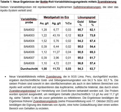 • Neue Variabilitätstests mittels Zyanidierung, die in SGS Lima, Peru, durchgeführt wurden, ergaben durchschnittliche Gold- und Silbergewinnungsraten von 94,3 % bzw. 63,7 %. Die sieben Proben sind sowohl in den oberflächennahen als auch in den tieferen Bereichen von Apollo weit verteilt und repräsentieren das kupferarme, sulfidische Material, das durch einen Zyanidierungskreislauf zur Herstellung von Doré-Barren behandelt werden soll. Die Proben wurden speziell ausgewählt, um niedrigere Gehalte (durchschnittlich 1,0 g/t Au und 11,7 g/t Ag, siehe Tabelle 1) als die zuvor getesteten zu reflektieren. Die Ergebnisse bestätigen die Ergebnisse früherer Zyanidisierungstests (siehe Pressemitteilung vom 17. Oktober 2023) und bestätigen die Eignung des Materials von Apollo, eine hohe Goldauflösung über einen weiten Bereich von Gehalten zu erzielen.