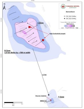 Canada Nickel verfolgt auch ähnliche Ziele innerhalb der B-Zone, die bei einer halb-luftgestützten EM-Vermessung (Drohne und Bodenschleife) hervorgehoben wurden, die im Sommer 2024 von Rosor Corp. durchgeführt wurde. Die Vermessung zeigt zwei weitere Ziele mit höherer Leitfähigkeit/geringerem Widerstand innerhalb der B-Zone.