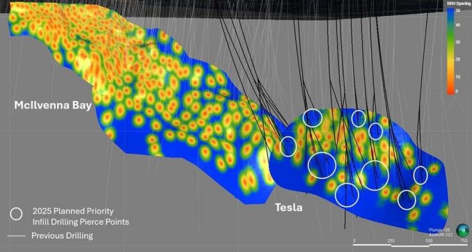 Die endgültigen Untersuchungsergebnisse des Infill-Bohrprogramms 2024 in der Zone Tesla liegen ebenfalls vor. Das Sommerbohrprogramm bei Tesla wurde vom Land aus durchgeführt, wobei Richtbohrtechnologien eingesetzt wurden, um senkrechte Abschnitte durch die Zone von der Fußseite aus zu erhalten und größere Lücken innerhalb der aktuellen Bohrlochabstände, die vom Land aus zugänglich sind, zu füllen.