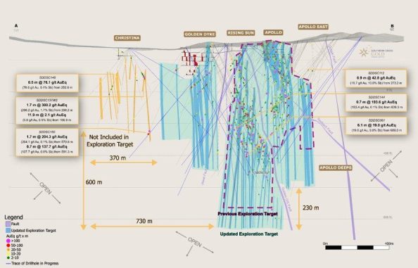 Tabelle 4 ). Für insgesamt 70 der Adersätze wurden die Gehalte anhand von zusammengesetzten Untersuchungsdaten geschätzt, während für 15 Adersätze der berechnete Durchschnittsgehalt von Rising Sun (7,8 g/t Au und 0,8 % Sb in Kleinbuchstaben und 11.5 g/t Au und 1,0 % Sb), Apollo (unterer Fall 3,8 g/t Au und 0,7 % Sb und oberer Fall 4,1 g/t Au und 0,7 % Sb) oder Golden Dyke (unterer und oberer Fall 5,6 g/t Au, 1,0 % Sb) und dies wurde auf das Explorationsziel angewendet. Die Bohrungen deuten darauf hin, dass Rising Sun höhere Gold- und Antimongehalte als Apollo und Apollo Deep enthalten könnte, wobei Golden Dyke noch nicht bis in die Tiefe erprobt wurde, um die Neigung zu höheren Gehalten zu bestimmen.