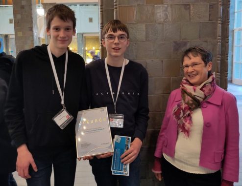 Das Kunststoff-Zentrum SKZ hat das Projekt „Umweltretter auf sechs Beinen“ von Jonas Kirchner und Marc Kolb vom Kronberg-Gymnasium Aschaffenburg ausgezeichnet. Die beiden haben es sich zum Ziel gesetzt, einen Weg zu finden, wie problematische Kunststoffabfälle in der Zukunft effizienter und schneller abgebaut werden können. In ihrem Projekt untersuchen sie deshalb, ob und wie Mehlwürmer aufgeschäumtes Polystyrol verdauen können. Dabei erforschen sie, welche Kunststoffe Mehlwürmer zusätzlich fressen können, ob es Unterschiede zwischen verschiedenen Arten gibt und wie Veränderungen verschiedener Umweltfaktoren wie Licht, Temperatur und Sauerstoffgehalt dazu beitragen können. „Die Begeisterung für Wissenschaft ist so richtig spürbar und wir sind stolz darauf, diese jungen Forscher zu unterstützen. Gleichzeitig freuen wir uns schon auf viele weitere spannende neue Ideen in den kommenden Jahren“, so Hatz.