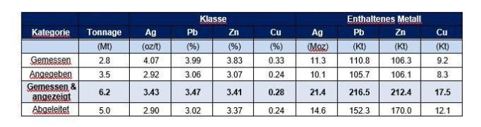 Anmerkung: AgEq berechnet unter Verwendung konstanter Preise zu Vergleichszwecken (Pb Tonnen x $1.984+ Zn Tonnen x $2.755+ Cu Tonnen x $9.369)/$26)+ Ag oz Umwelt