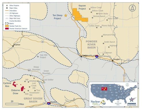 Premier American Uranium Inc. ("PUR" oder "Premier American Uranium") (TSXV: PUR, OTCQB: PAUIF) (- https://www.commodity-tv.com/play/premier-american-uranium-updated-resource-and-pea-planned-for-cebolleta-in-2025/ -) und Nuclear Fuels Inc. ("NF" oder "Nuclear Fuels") (CSE: NF, OTCQX: NFUNF) freuen sich, bekannt zu geben, dass sie am 4. Juni 2025 eine endgültige Vereinbarung (die "Arrangement-Vereinbarung") abgeschlossen haben, der zufolge Premier American Uranium zugestimmt hat, alle emittierten und ausstehenden Stammaktien von Nuclear Fuels (die "NF-Aktien") im Rahmen eines gerichtlich genehmigten Arrangement-Plans (das "Arrangement" oder die "Transaktion") zu erwerben. Nuclear Fuels hält eine 100%ige Beteiligung am Kaycee-Uranprojekt ("Kaycee"), das sich in Wyomings ertragreichem Powder River Basin befindet (Abbildung 1). Das Kaycee-Projekt erstreckt sich über einen 35 Meilen-Trend von veränderten und mineralisierten Sandsteinen, der durch über 4.200 Bohrlöcher und 430 Meilen kartierter Rollfronten unterstützt wird. Neben Kaycee besitzt Nuclear Fuels auch fünf Projekte im Explorationsstadium in wichtigen Urangebieten in Wyoming, Utah und Arizona.