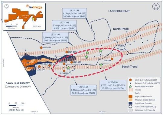 Der Trend Hurricane South, wo die Winterbohrlöcher LE25-207 und LE25-210 eine starke Radioaktivität durchschnitten. Das Bohrloch LE25-207, das sich 240 m östlich von Hurricane befindet, ergab einen durchschnittlichen RS-125-Wert von 8.800 cps auf über 0,5 Metern im Kern und einen entsprechenden maximalen Wert der Bohrlochsonde von 30.096 cps, während LE25-210, das 480 m östlich von Hurricane gebohrt wurde, durchschnittlich bis zu 3.700 cps auf 0,5 Metern im Kern und einen entsprechenden maximalen Wert der Bohrlochsonde von 20.280 cps ergab.
