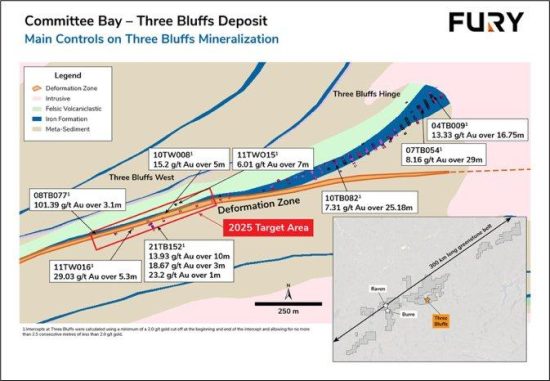 Die hochgradige Goldlagerstätte Three Bluffs befindet sich im Zentrum des Projekts und enthält schätzungsweise 524.000 Unzen Gold in 2,1 Millionen Tonnen (Mt) mit einem Goldgehalt von 7,85 g/t in der Kategorie „angezeigt“ und 720.000 Unzen in 2,9 Mt mit einem Goldgehalt von 7,64 g/t in der Kategorie „abgeleitet“ (siehe NI 43-101-konformer Bericht „Technical Report on the Committee Bay Project, Nunavut Territory, Canada” vom 11. September 2023). Bei den Bohrungen im Jahr 2021 wurden bei Three Bluffs drei Mineralisierungszonen durchschnitten: 13,93 g/t Gold auf 10 m; 18,67 g/t Gold auf 3 m und 23,2 g/t Gold auf 1 m (siehe Pressemitteilung vom 1. Dezember 2021). Die ersten beiden genannten Abschnitte liegen außerhalb der Haupteisenformation in gescherten Metasedimenten. Die in der Scherzone beherbergte Mineralisierung verläuft subparallel zur Haupteisenformation (Abbildung 1) und wurde bisher noch nicht gezielt erkundet. Die Abschnitte aus dem Jahr 2021 liegen etwa 250 m unter der Oberfläche und sind sowohl neigungsaufwärts als auch neigungsabwärts sowie entlang des Streichens in beide Richtungen weiter aufgeschlossen. Die Bohrungen im Jahr 2025 werden auf die subparallele Scherzone sowie die Eisenformation selbst abzielen, wobei fünf bis sechs Step-outs von den Abschnitten aus dem Jahr 2021 für Bohrungen auf 2.750 m vorgesehen sind (Abbildung 2).