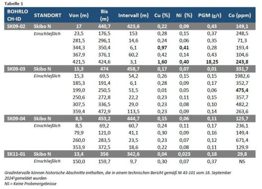 - 113,5 m mit 0,23 % Cu, 0,09 % Ni und 0,14 g/t PGE