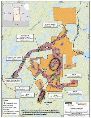 IsoEnergy Ltd. (NYSE American: ISOU | TSX: ISO) („IsoEnergy” https://www.commodity-tv.com/ondemand/companies/profil/isoenergy-ltd/) und Purepoint Uranium Group Inc. (TSXV: PTU | OTC: PTUUF) („Purepoint“) freuen sich, weiterhin gute Ergebnisse aus den Bohrungen ihres 50/50-Joint-Venture-Projekts Dorado („Dorado“ oder das „Projekt“) bekannt zu geben, das sich in Saskatchewans erstklassigem Athabasca-Becken befindet (Abbildung 1). Die jüngste Bohrung, PG25-07A, wurde etwa 70 Meter nordöstlich der „Nova Discovery“-Abschnitte im Zielgebiet Q48 niedergebracht und lieferte eine stärkere Mineralisierung mit durchschnittlich 11.100 Zählschritten pro Sekunde (CPS), die mit einer Radiometersonde für Bohrlochvermessungen des Typs Mount Sopris 2PGA-1000 in einem viel längeren Abschnitt von 14,0 Metern gemessen wurden, einschließlich eines Spitzenwertes von 110.800 CPS.