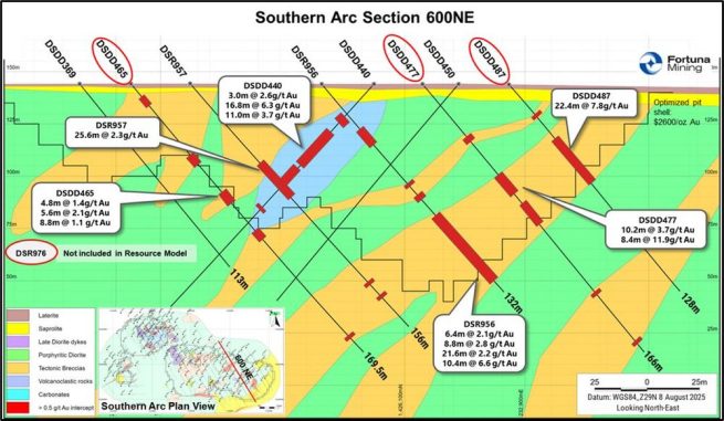 Von den 152 Bohrlöchern wurden 53 nach dem Stichtag für die erste abgeleitete Mineralressource von Southern Arc von 3,9 Mio. Unzen Gold abgeschlossen.9 Mio. mit durchschnittlich 1,57 g/t Au und 194 Koz Gold (siehe Pressemitteilung von Fortuna vom 5. August 2025) abgeschlossen und werden zusammen mit den für das vierte Quartal 2025 geplanten zusätzlichen Bohrungen in eine aktualisierte Ressourcenschätzung einfließen, die für das erste Quartal 2026 geplant ist. Einzelheiten zu den abgeschlossenen Bohrlöchern sind in Anhang 1 aufgeführt.