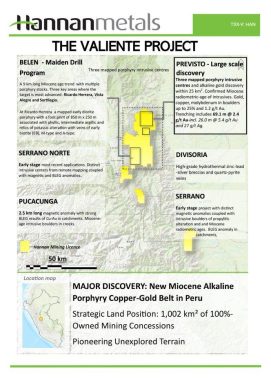 Im Laufe des Jahres 2021 hat Hannan 1.002 km²an zu 100 % unternehmenseigenen Bergbaukonzessionen in Valiente abgesteckt und hält diese nach wie vor. Diese umfassen unerforschtes Gelände mit potenziellen mineralisierten Porphyr-Zielen im zentralen Osten Perus. Das Projekt Valiente hat sich rasch von einem Greenfield-Prospektionsprojekt zu einer Multi-Prospektionsmöglichkeit entwickelt.