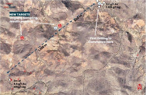 – Diese Ziele entsprechen vorherigen hochgradigen Ergebnissen wie einer Probe mit 3,2 g/t Au und 1.225 g/t Ag, 800 Meter nordöstlich, und einer 2-Meter-Splitterprobe mit 5,6 g/t Au und 106 g/t Ag, 1.100 Meter südwestlich.