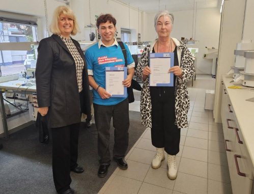 In der Zahntechnik müssten Hand und Kopf minutiös im Einklang sein, erklärt sie weiter. Und das ist bei Aron der Fall. Auch wenn in der Schule, dem Oberstufenzentrum Johanna Just, die theoretische Ausbildung manchmal nicht ganz so erfolgreich läuft: „Aron sucht sich Unterstützung und lernt mit seinen Klassenkameraden gemeinsam“, weiß sie zu berichten.  Und wenn jetzt auch die keramischen Aufgaben noch geübt werden, steht einem erfolgreichen Gesellenabschluss im Winter für Aron nichts mehr im Weg.