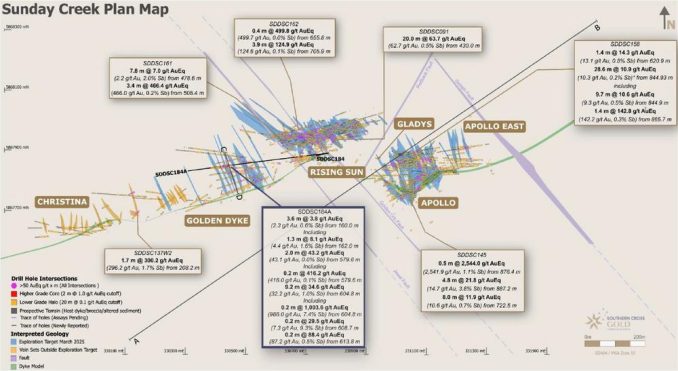 - SDDSC184A lieferte die beiden höchsten jemals bei Golden Dyke gemessenen Einzelgoldgehalte – 986 g/t Au und 416 g/t Au, beide in alteriertem Sediment –, was ein außergewöhnliches Gehaltspotenzial zeigt, das mit Rising Sun vergleichbar ist.