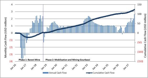 Die durchschnittliche jährliche Goldproduktion über die gesamte Lebensdauer der Mine wird auf 11.300 Unzen (oder ca. 942 Unzen pro Monat) geschätzt, wobei die gesamte verwertbare Goldproduktion für die Lagerstätten Barani und Gourbassi auf insgesamt etwa 113.100 Unzen prognostiziert wird.