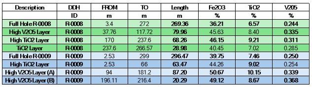 o Bohrung R-0009 (von der Oberfläche aus gebohrt): 296,47 m mit 39,75 % Fe2O3, 7,46 % TiO2, 0,25 % V2O5 - 193 von 418 Proben mit einem Gehalt von über 7 % TiO2, davon 97 von 418 mit einem Gehalt von über 10 % TiO2 (die meisten Proben haben eine Länge von 2 Metern)