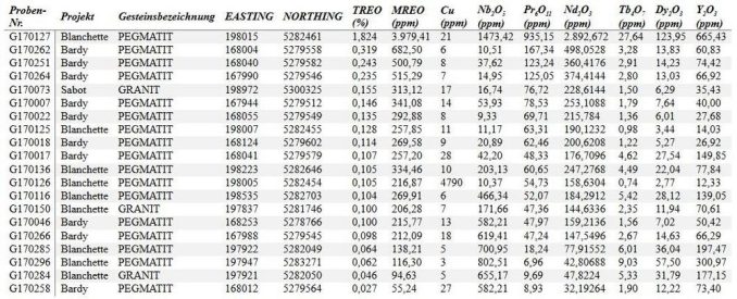 – Blanchette: Eine ausgewählte Schürfprobe aus einem Gesteinsausbiss ergab 1,82 % TREO; darin enthalten waren 3.979,41 ppm MREO (2.892,67 ppm Nd₂O₃, 935,15 ppm Pr₆O₁₁, 123,95 ppm Dy₂O₃ und 27,64 ppm Tb4O7) sowie 0,14 % Nb₂O₅.