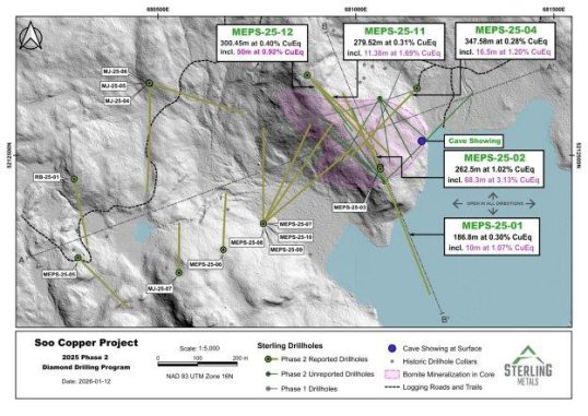 Sterling Metals Corp. (TSXV: SAG, OTCQB: SAGGF) („Sterling“ oder das „Unternehmen“) freut sich, über die neuen Analyseergebnisse aus seinem erweiterten und mittlerweile abgeschlossenen Bohrprogramm 2025 im Kupferprojekt Soo („Kupferprojekt Soo“ oder das „Projekt“) unweit von Batchewana Bay in Ontario zu berichten. Diese neuen Ergebnisse belegen die weitere Ausdehnung einer durchgehenden Zone mit porphyrischer Kupfermineralisierung, die erstmals Anfang letzten Jahres in Bohrloch MJ-25-01 entdeckt wurde und bei der man später herausfand, dass sie eine sehr hochgradige Bornitmineralisierung aufweist, wie bereits im Rahmen der Entdeckungsbohrung MEPS-25-02 berichtet (siehe Pressemitteilung vom 29. September 2025).