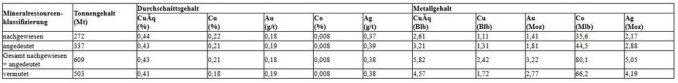 – Die Metallgehalte wurden mit den folgenden metallurgischen Gewinnungsfaktoren berechnet: Cu = 85 %, Au = 89 %, Co = 78 % und Ag = 68 %.