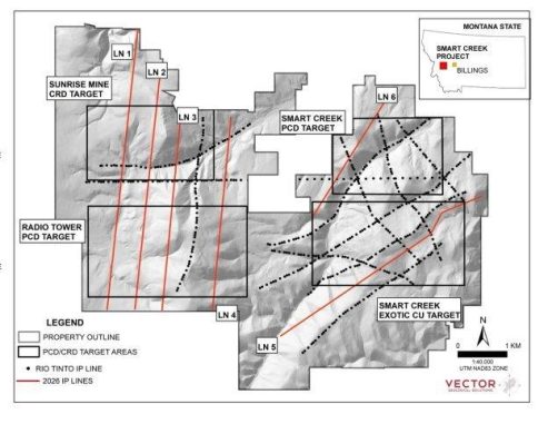 Domestic Metals beauftragte TMC Geophysics mit der Durchführung einer Untersuchung der induzierten Polarisation (IP) auf dem Projekt Smart Creek, das sich 70 km südöstlich von Missoula im US-Bundesstaat Montana befindet. Die Feldarbeiten fanden zwischen dem 6. Februar und dem 2. März 2026 statt und umfassten 26 Linienkilometer an IP-Daten, die mit einer Pole-Dipole-Elektrodenanordnung erfasst wurden (Abbildung 1).