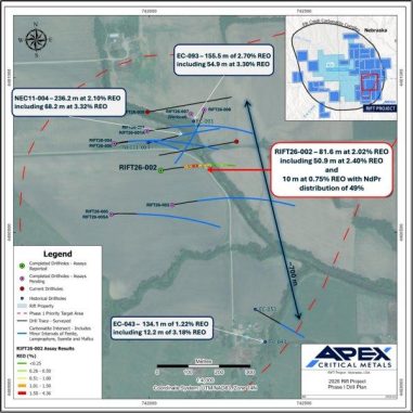 Apex Critical Metals Corp. (CSE: APXC | OTCQX: APXCF | FWB: KL9) („Apex“ oder das „Unternehmen“), ein kanadisches Mineralexplorationsunternehmen, das sich auf die Identifizierung und Erschließung kritischer und strategischer Metalle konzentriert, freut sich, die Analyseergebnisse aus der Bohrung RIFT26-002 bekannt zu geben. Dabei handelt es sich um die ersten Analyseergebnisse aus der Bohrkampagne 2026 des Unternehmens auf seinem zu 100 % gehaltenen Seltenerdmetallprojekt Rift, das sich im Elk Creek-Karbonatitkomplex im Südosten von Nebraska, USA, befindet.