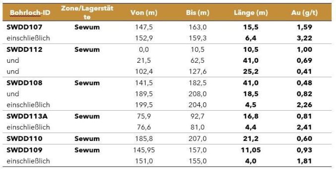 Diese Pressemitteilung berichtet über die Ergebnisse von 8 DD-Bohrlöchern mit einer Gesamtlänge von 1.685 m (SWDD107 bis SWDD114), die auf die Sewum-Goldlagerstätte abzielten, wobei alle Bohrlöcher eine Goldmineralisierung durchschnitten. Im Rahmen des laufenden Bohrprogramms bei Enchi wurden insgesamt 34.805 m in 256 Bohrlöchern gemeldet, wobei 98 % der Bohrlöcher eine Goldmineralisierung durchschnitten.