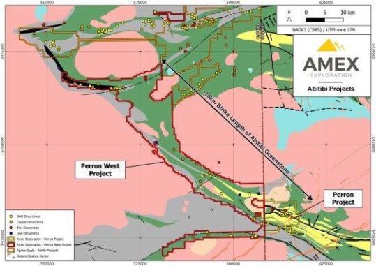 Amex Exploration Inc. hat beim zu 100 % unternehmenseigenen Projekt Perron, das sich etwa 110 Kilometer nördlich von Rouyn-Noranda in Quebec befindet, bedeutende hochgradige Goldvorkommen sowie kupferreiche vulkanogene Massivsulfid- (VMS)-Zonen entdeckt. Das Projekt Perron in Quebec umfasst 183 zusammenhängende Claims mit einer Fläche von 65,72 km² und umfasst mehrere Zonen mit hochgradiger Goldmineralisierung, VMS-Mineralisierung sowie „hybrider“, goldreicher VMS-Mineralisierung.