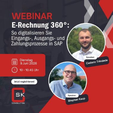 Titel: E-Rechnung 360°: So digitalisieren Sie Eingangs-, Ausgangs- und Zahlungsprozesse in SAPDatum: 9. Juni 2026Uhrzeit: 10:00 bis 10:45 UhrReferenten: Stephan Kaup und Cederic TrindadeFormat: Webcast mit Live-Demo