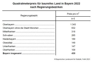 Der Quadratmeterpreis für die Verkäufe von baureifem Land beläuft sich in Bayern im Jahr 2022 im Durchschnitt auf 430 Euro. Dabei bestehen zwischen den einzelnen Regierungsbezirken große […]