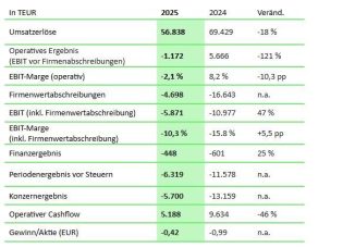 Umsatzerlöse EUR 57 Mio. (-18 Prozent ggü. Vorjahr) Operatives Ergebnis (vor Firmenwertabschreibungen) von EUR -1,2 Mio. bei einer operativen EBIT-Marge von -2 Prozent Positiver operativer […]